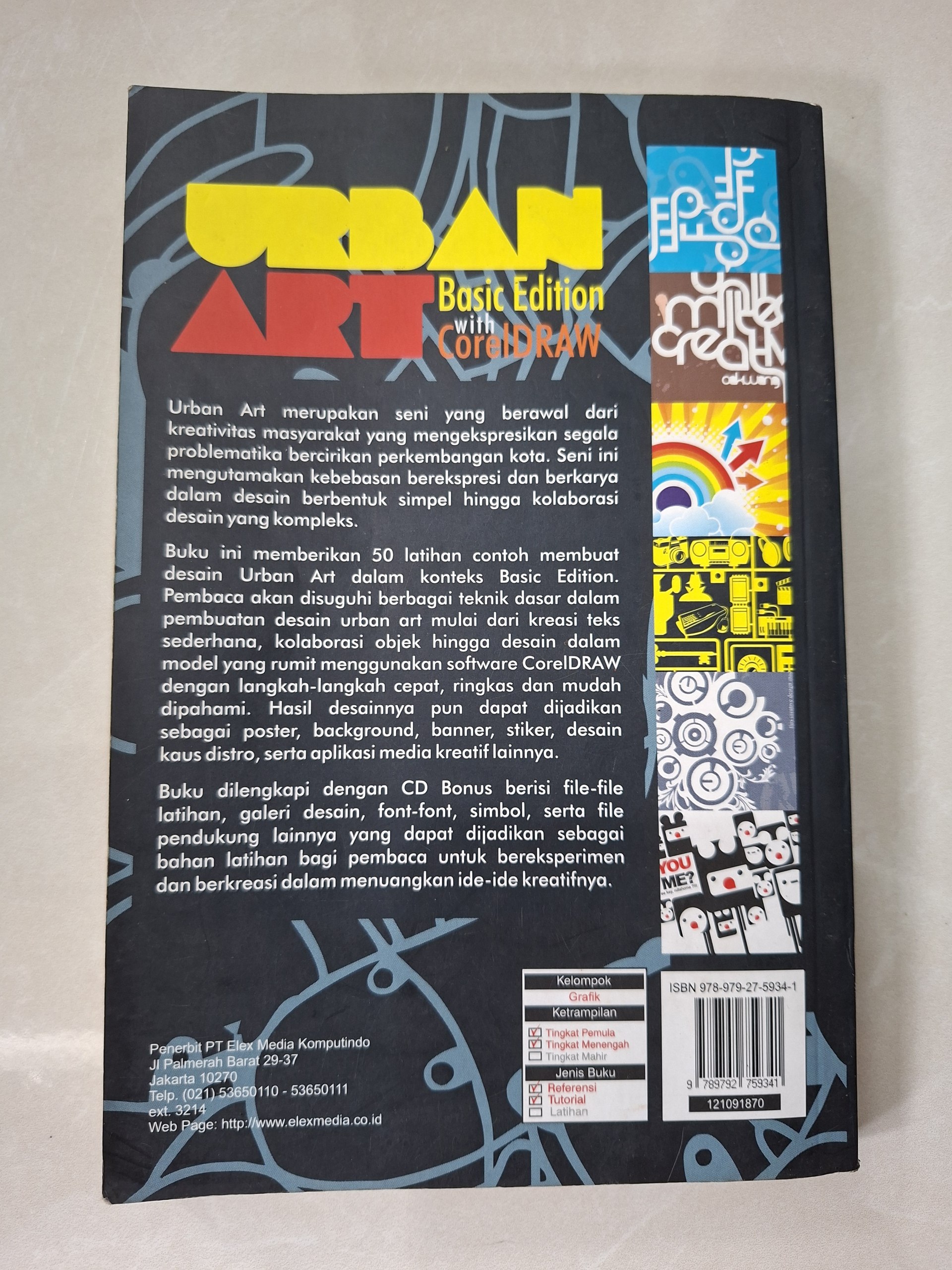 Buku Urban Art Basic Edition with CorelDRAW kondisi bekas dan masih layak baca. Berisi panduan dasar desain grafis menggunakan CorelDRAW dengan contoh karya dan inspirasi desain.